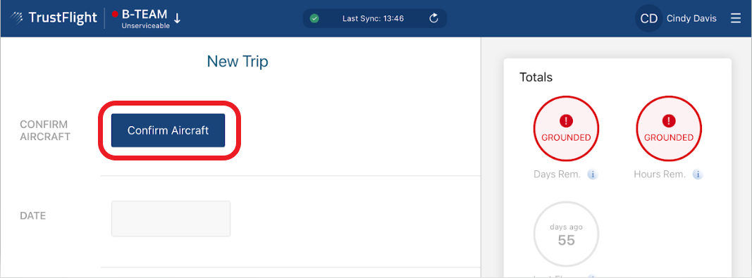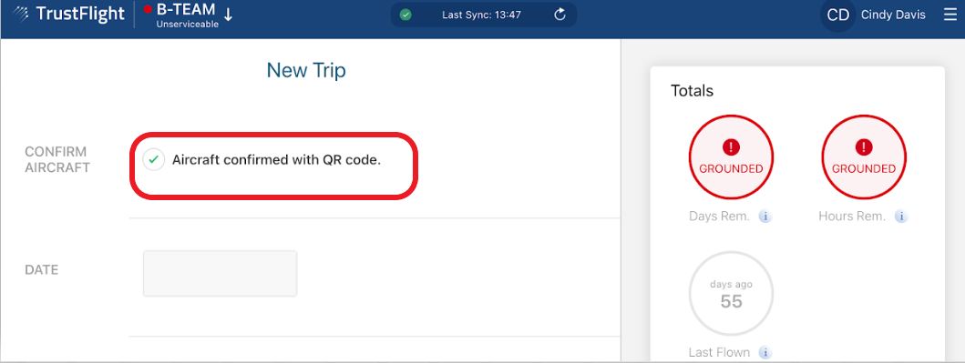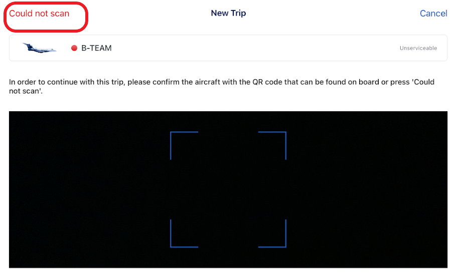5. When a QR Code has not been used to Confirm Aircraft Could not Scan QR Code will be visible on the New Trip