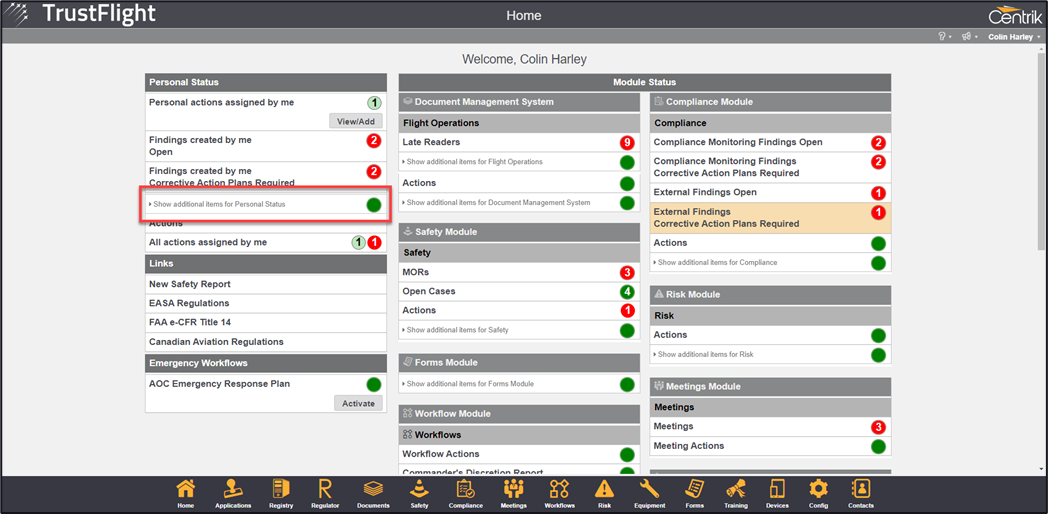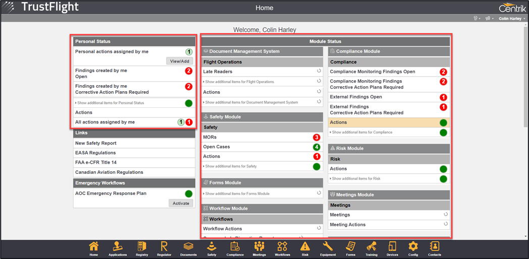 If a user clicks on one of the traffic lights, then they will be redirected to the area that displays the items. The user will also see a list of all the modules along the bottom of the screen that they have access to.