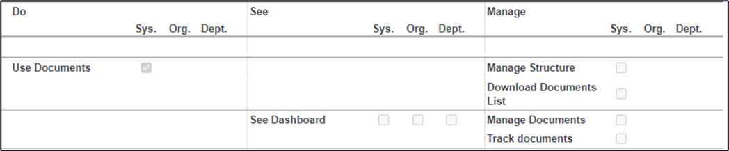 Access rights can be given for the entire system (Sys), at Organisational (Org) level (if a multi-Org Centrik site) or at a department (Dept) level that an individual is in.