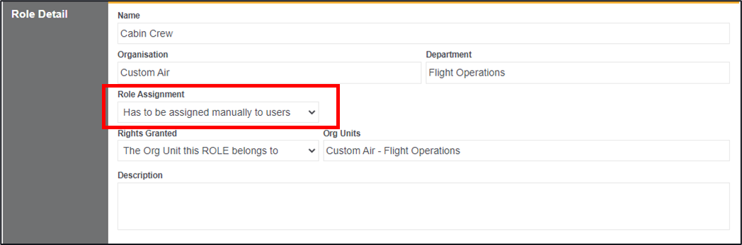 If the selectable option is set to ‘assigned manually to users’, then role assignments need to be given individually to contacts. If the option is set to ‘assigned automatically’ then when a user is added to Centrik in that role the access rights are controlled from the role level within that department. This allows you to create consistent access rights based on a role within your organisation.