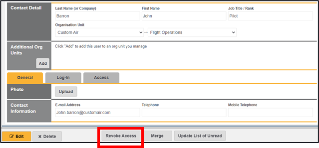2. Once in their individual record click on the ‘Revoke Access’ button