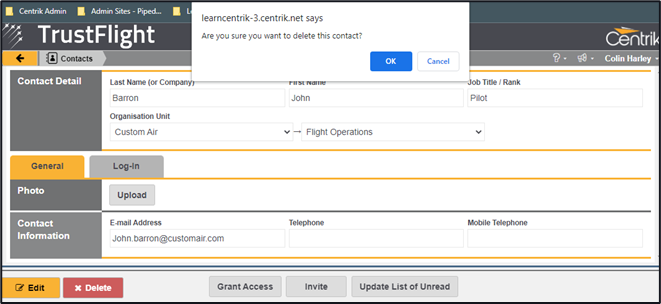 The user’s access to Centrik has been removed, they will still remain on the contacts list for your organisation but cannot access Centrik.