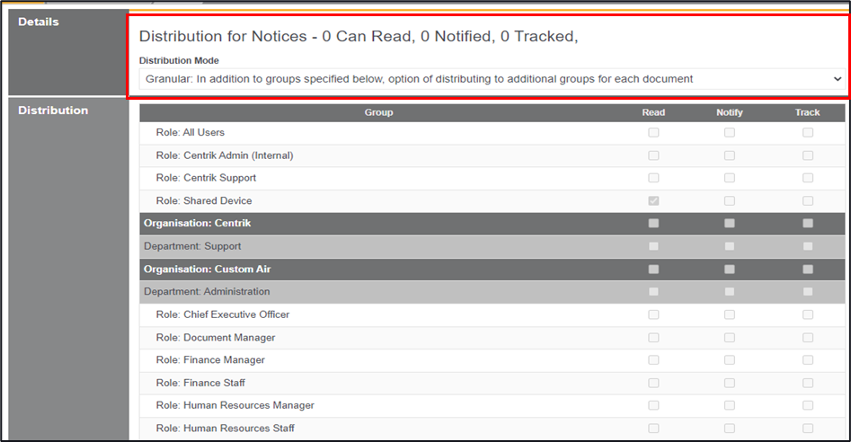 Notify – Ticking the notify checkbox will automatically tick the read checkbox, this level will notify individuals on the role distribution via email when a new document has been uploaded.