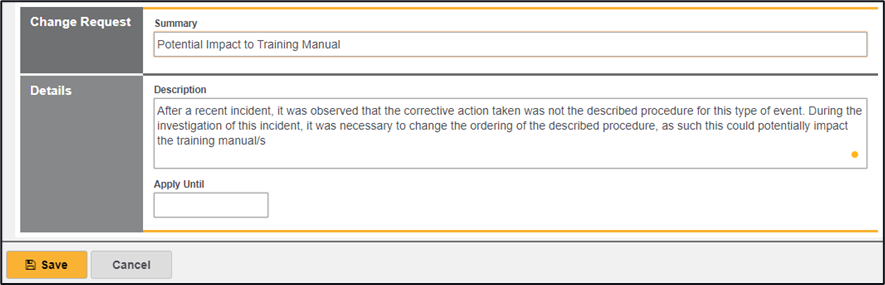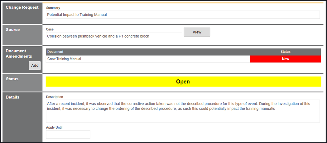 A change request can occur within a Safety case, an Audit finding, via a Regulation change or by a Document Manager within a document (if enabled to accept change requests).