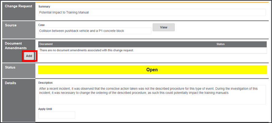 4. Link the document that you believe to be impacted by this change using the ‘Add’ button within the Document Amendments section