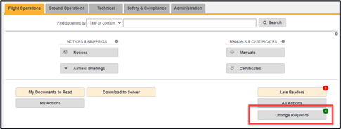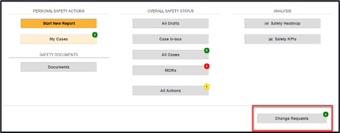Change Requests can be viewed within each area (Safety, Documents and Compliance) by clicking on the Change Requests button.