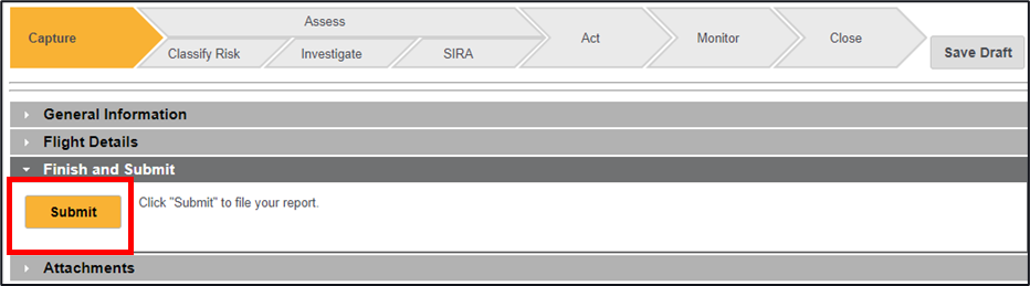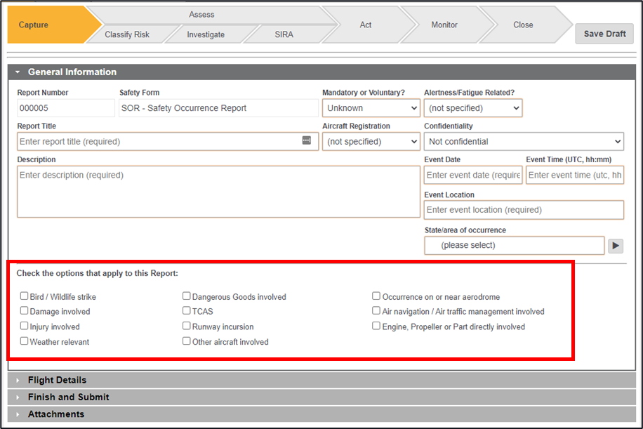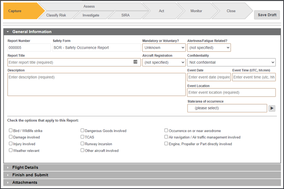 The capture phase is where specific information is collected relating to this specific event or occurrence. The details entered in this area will allow the Safety Manager to Assess and classify this event or occurrence when it moves through to the assess phase, so it is important that it contains as much information as possible.