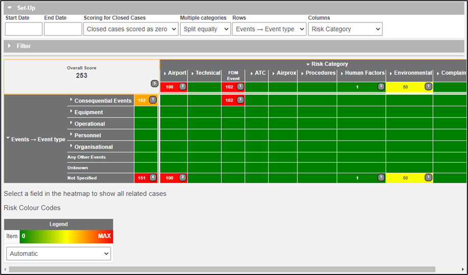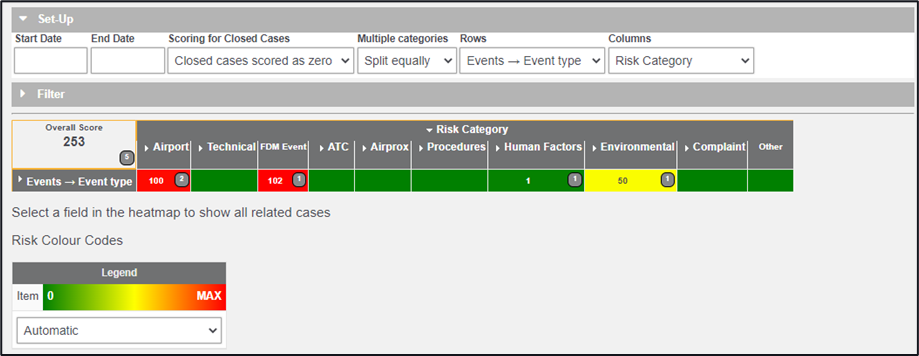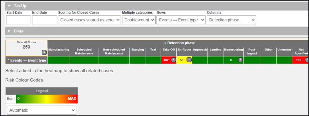 Depending on what is selected within the Filter the heatmap displays the Safety Cases which match that selection.