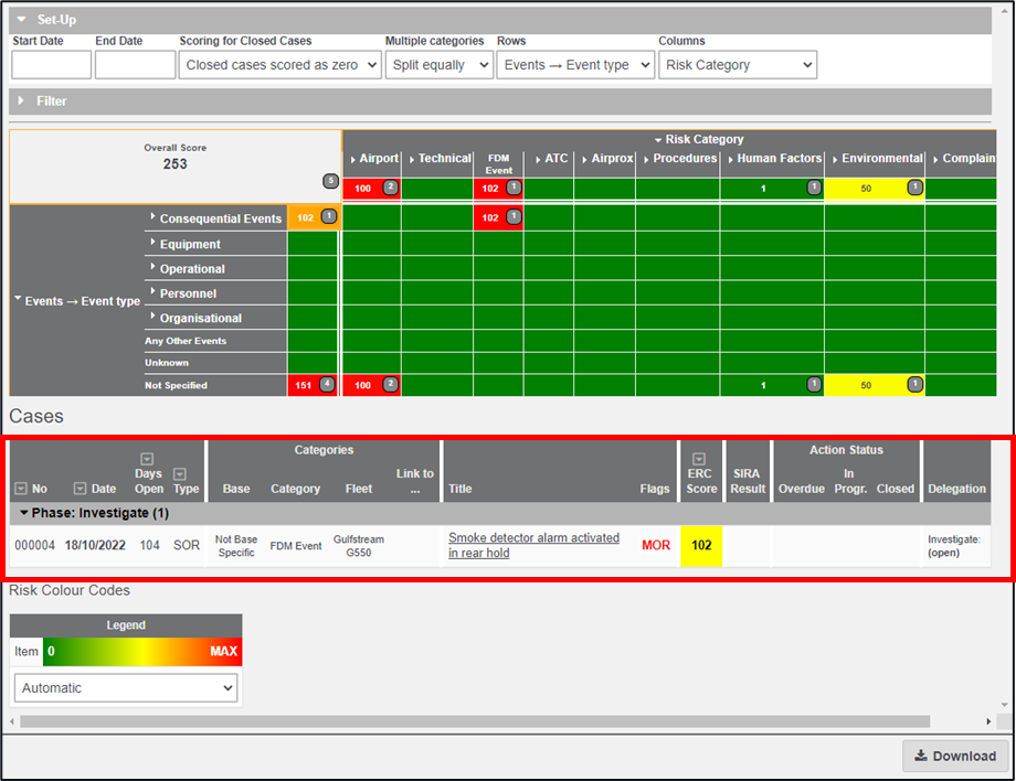 Within each cell there are two numbers. The first number is the total Score of all the Safety Cases (Depending on what is selected within the Scoring Dropdown, this may include closed Cases).