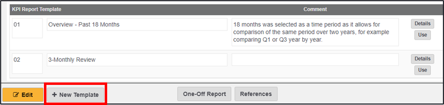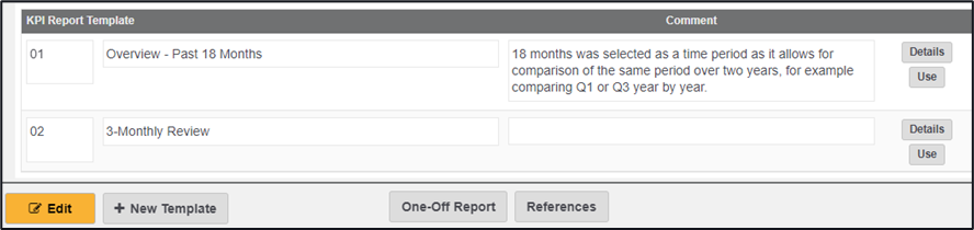 On the overview screen of the templates the ‘details’ button will show which reports are used within this template. The ‘use’ button will allow you to use this template and pull up the reports it contains.