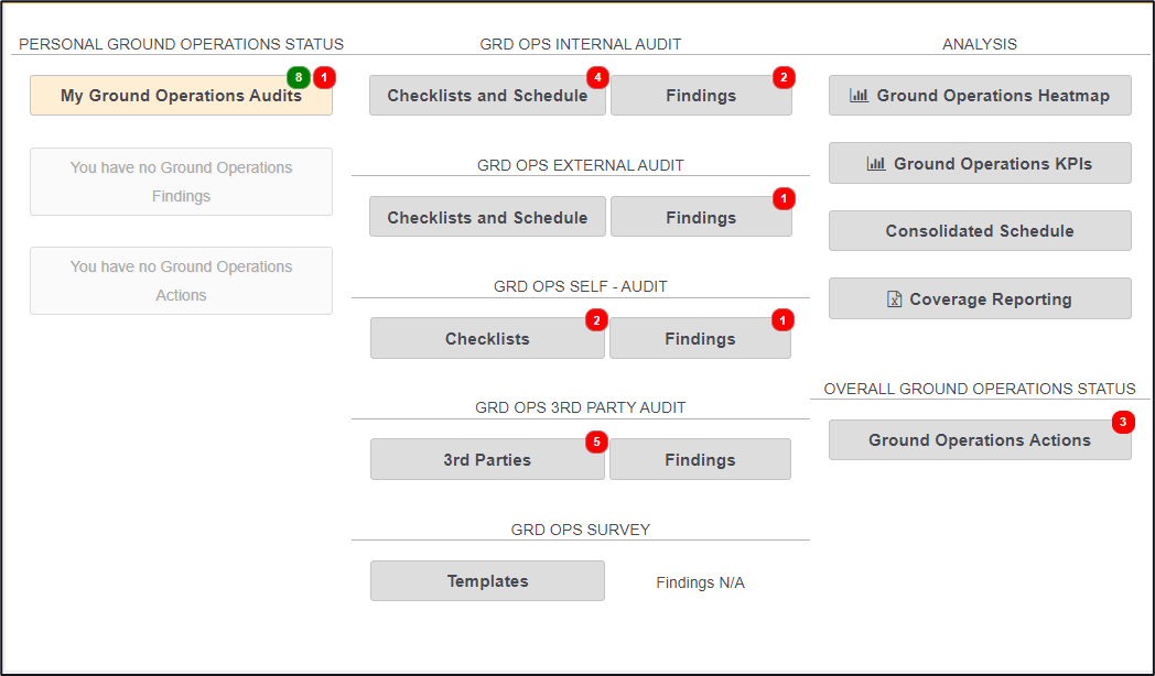 The left-hand side ‘Personal Quality’ lists any Audits, Findings or Actions that the Logged in user is responsible for. Audits, Findings and Actions have their own buttons and will only appear if there is something assigned to the user.