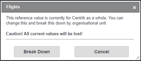 There is an ‘overall’ classification within this page, if set to overall Centrik will use these vales as an overall value for your organisation. If you have a multi organisation and multi-AOC and want to split out these values per organisation or AOC, then clicking on the ‘overall’ word for each reference will open a screen allowing this reference value to be split via a ‘Break down’ button (A warning box will be displayed).