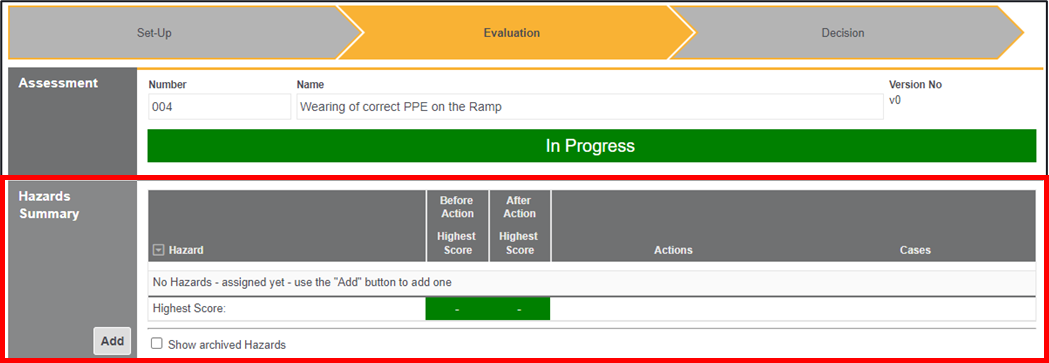 Hazards are captured within the evaluation phase of the risk assessment, enabling of this phase (clicking on the evaluation chevron) allows hazards to be added at this level and consequences to be added to those hazards at a lower, more granular level.