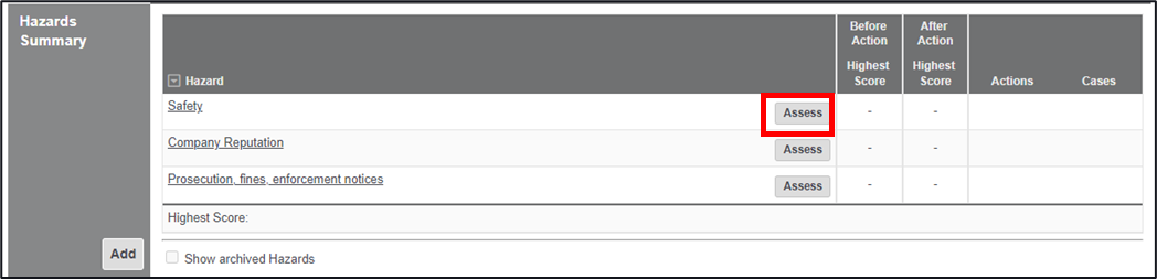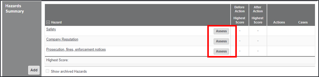 1. Click on the ‘Assess’ button at the end of an inputted hazard