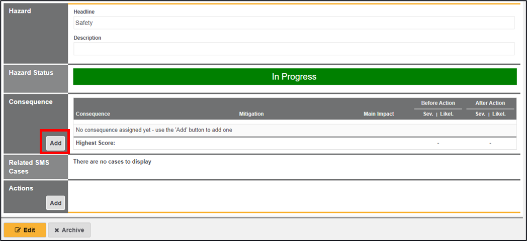 After adding as many hazards as required and clicking the save button enabled the ‘Assess’ button to become active next to each hazard that has been inputted, this button allows you to add consequences to each hazard.