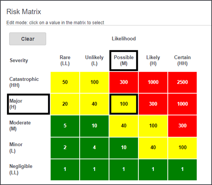 8. Clicking on the ‘likelihood’ box for each consequence will display the associated likelihood for the associated risk matrix