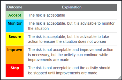 12. Under the current assessment area you are able to make a selection based on five options. Accept, Monitor, Secure, Improve or Stop. The ‘?’ button displays the meanings for these selections. Select one of these from the dropdown to continue.