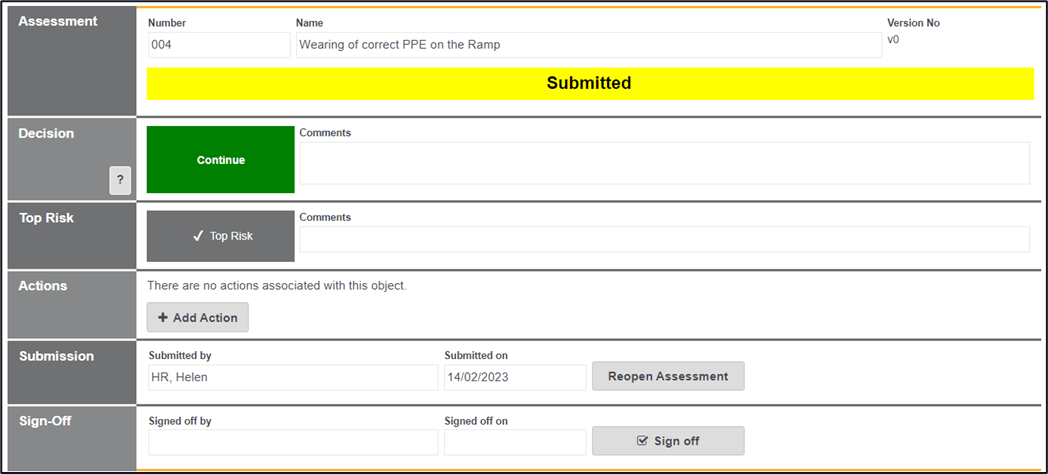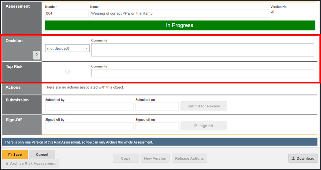 14. Clicking on the ‘Decision’ chevron will enable the sign-off phase of the risk assessment.