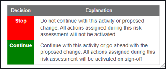 16. Within the decision area is where you can decide to either STOP or CONTINUE with this risk assessment. The ‘?’ button displays these two options and their meanings, simply select the appropriate one from the dropdown list
