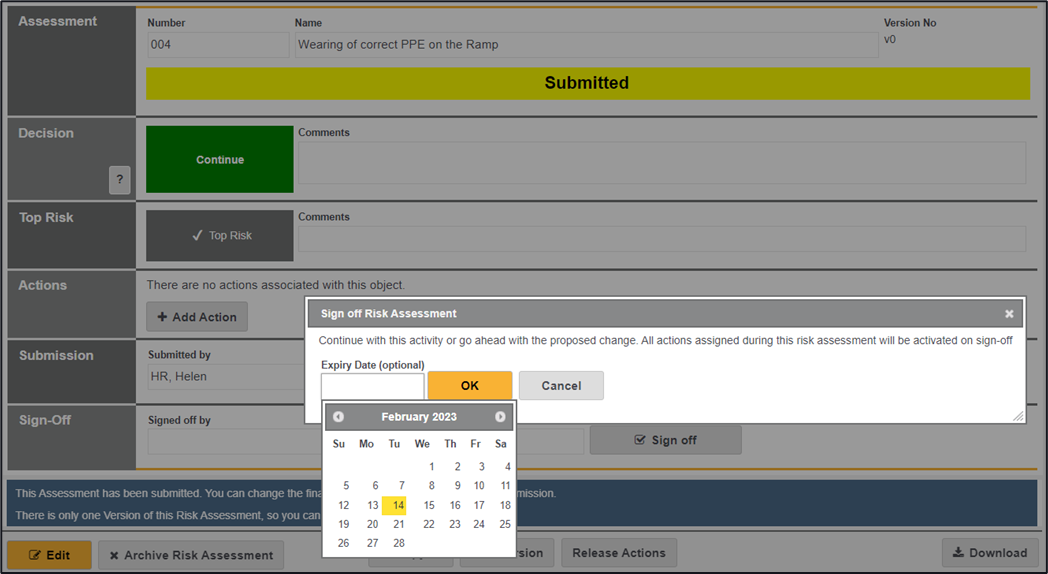 It is possible to Release this action if it forms part of your mitigation or needs to be completed prior to this risk assessment being signed-off. Simply clicking on the ‘Release’ button will make this action active