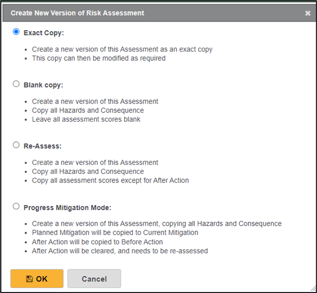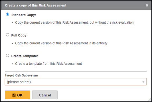 Standard Copy – Copies the current version of the risk assessment, but without the risk evaluation