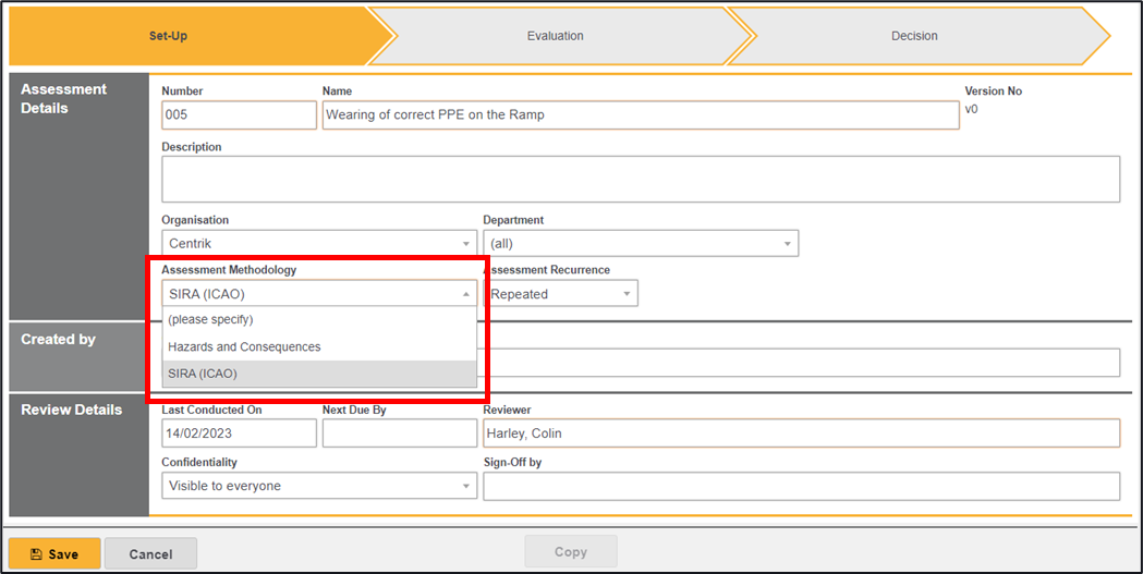 6. Under the Assessment Methodology are select SIRA (config required) from the dropdown list