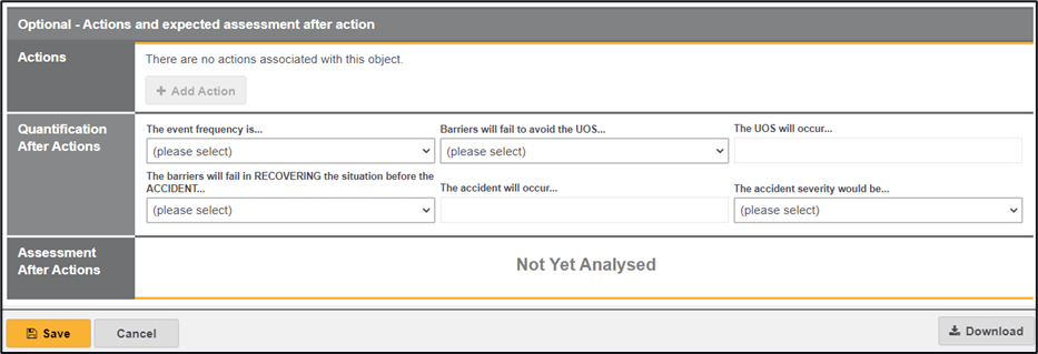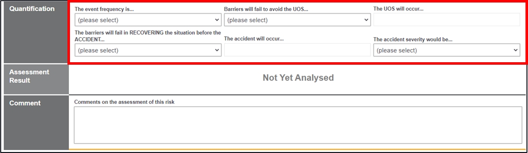 20. Move onto the Quantification area, this will assist you in calculating the risk based on the event frequency, barrier effectiveness and accident severity (select each area from the dropdowns)