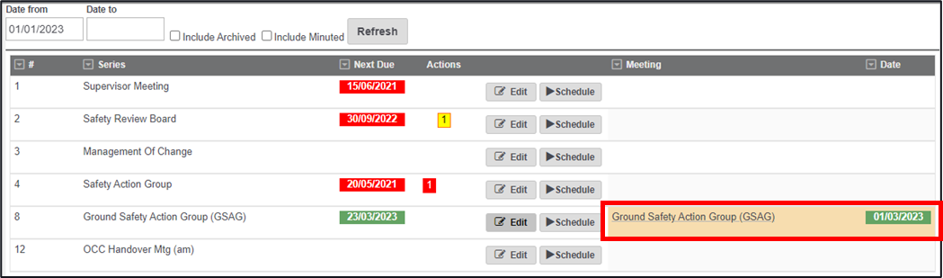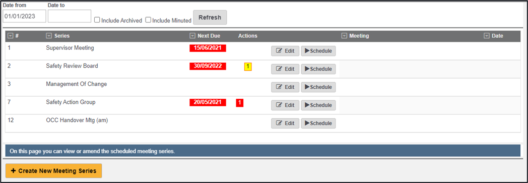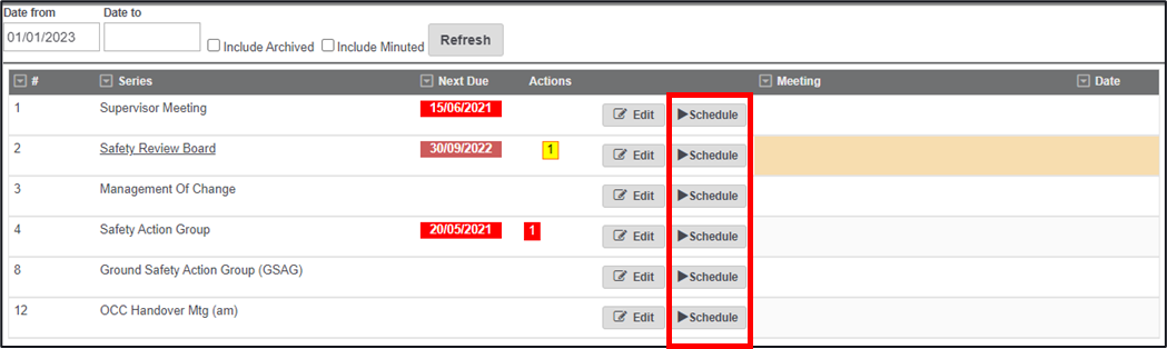 There is a searchable date area at the top of the page, each meeting has a Number, a Name, an area to display when it is Next due, an area for actions alongside an Edit and a Schedule button (access permissions required)
