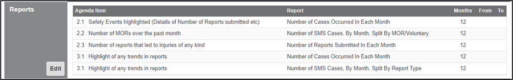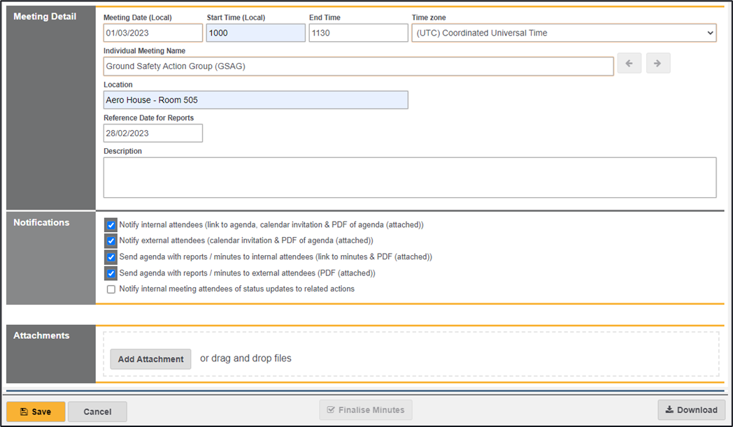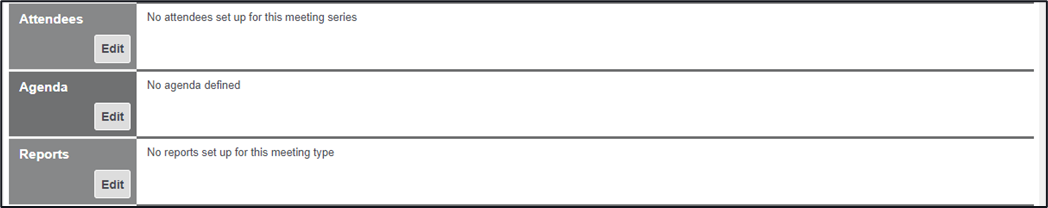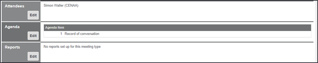 5. Enter in the attendees’ details, the agenda details, and any reports that you want to link or associate to this meeting by using the ‘Edit’ buttons within each section