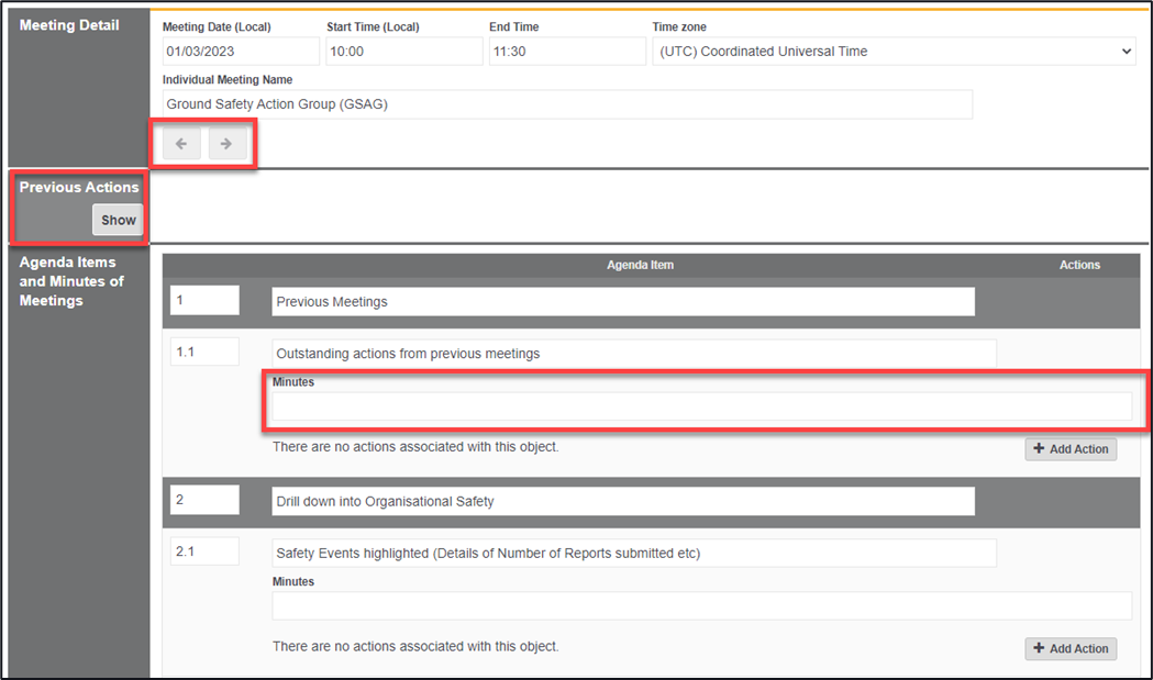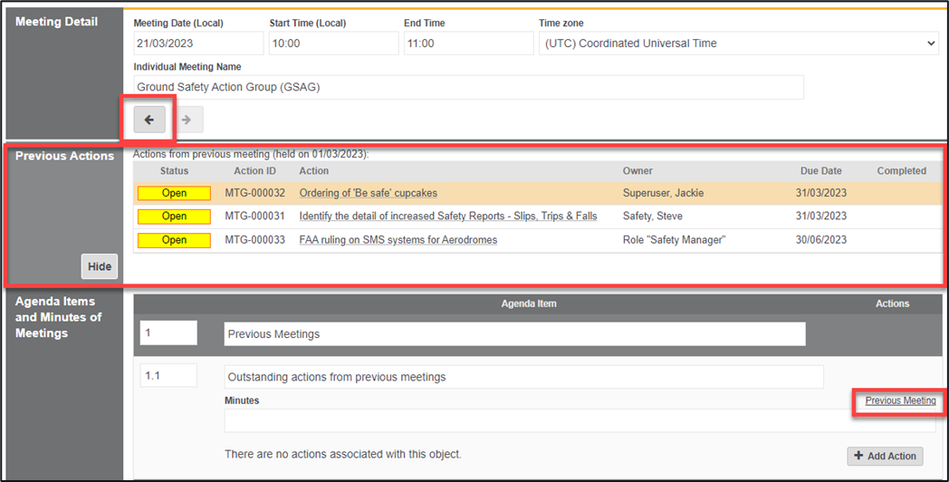 Previous Actions – clicking on the ‘Show’ button will display the actions created from previous meetings and their status