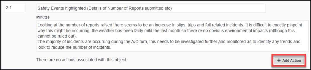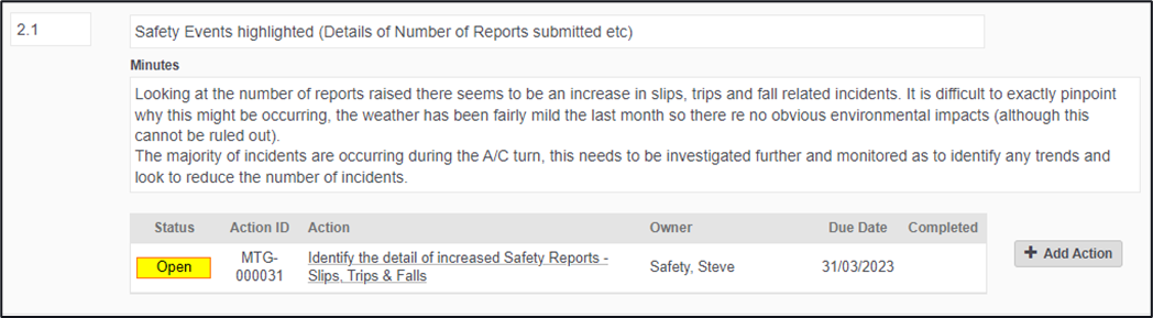 Navigating back to the meeting you are able to view the action within the minutes area of that agenda item, the status of this will change depending on the status of the action. You are able to add multiple actions to each agenda item (if required).