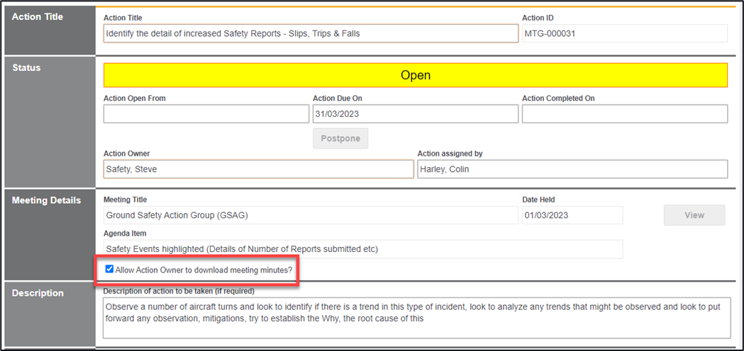 If the Action owner is not part of the meeting you are able to click on the checkbox and allow them permission to see the meeting minutes