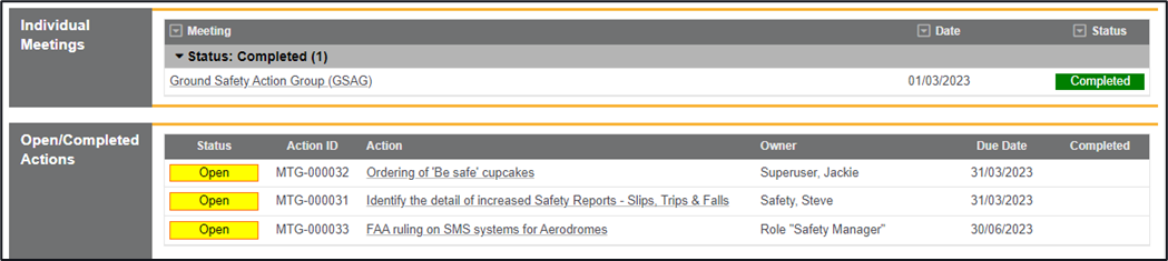 Details of all individual meetings are kept within the meeting series template for this type of meeting, navigating to the Individual meetings area there is an expandable/collapsible area to show completed, in progress meetings. Below that is an area for actions within this meeting type.