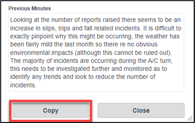 This action will enable you to view the previous meeting minutes, to copy these to this new meeting.