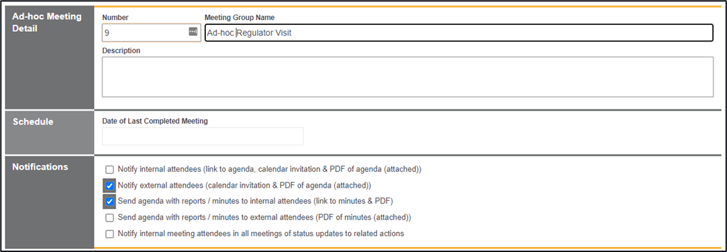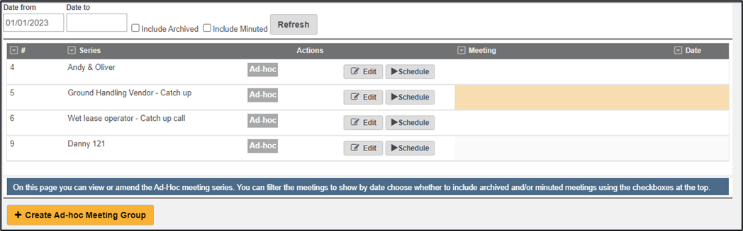 You are able to add to any of the Ad-hoc meetings created by clicking on the Schedule’ button, all meeting details including minutes are retained within each Ad-hoc meeting group.