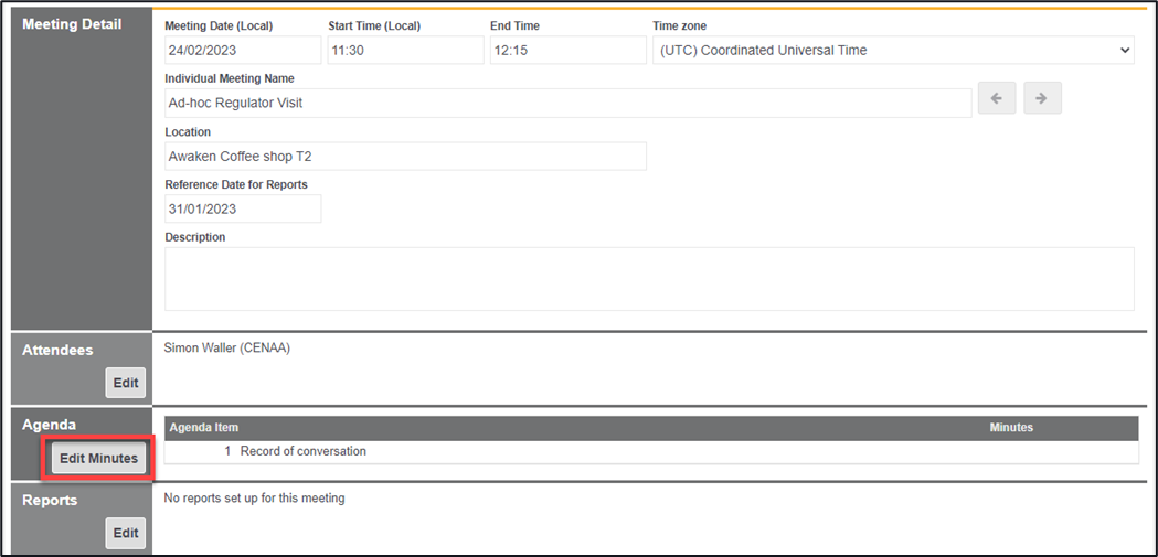 You are able to adjust the attendees using the ‘Edit’ button within the attendees to record exactly wo attended that individual meeting. Likewise you are able to add minutes by using the ‘Edit Minutes’ button within the agenda area.