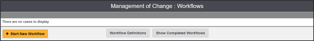 Management of change workflows will be displayed under the different stages or phases where they currently sit, this area will initially be blank with only the available system buttons showing until your first MOC is started.