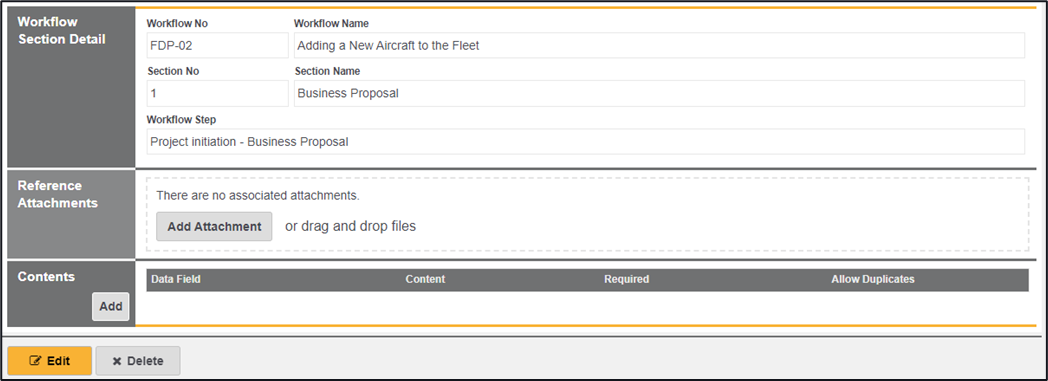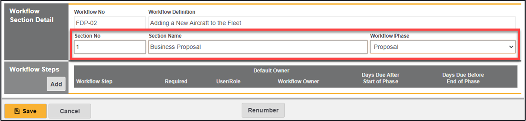 14. Move back to the main page of your workflow, continue adding sections and the details required within each section, selecting an appropriate phase for each section