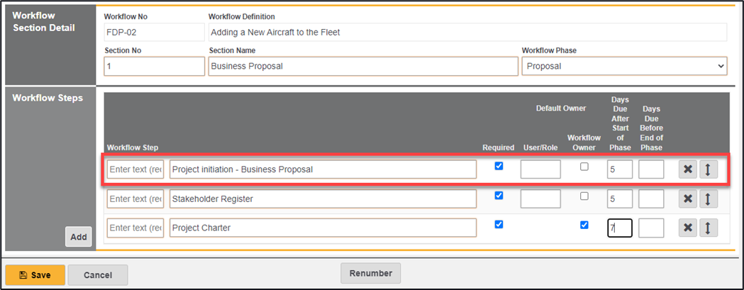6. Enter in the details of any due dates of steps, there are two areas available - Days Due After Start of Phase or Days Due Before End of Phase