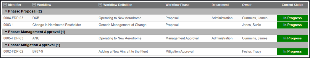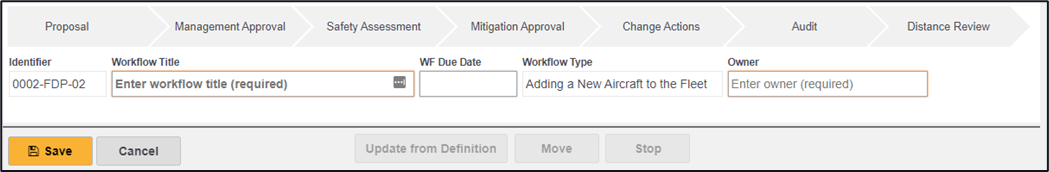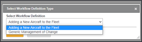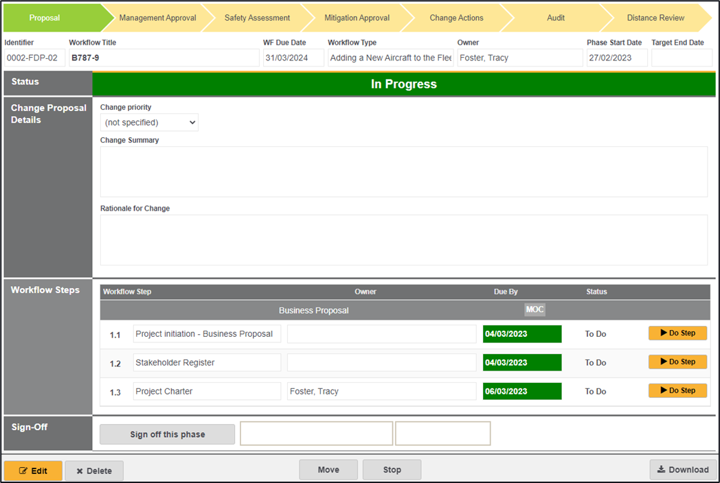 Prior to starting an MOC a workflow definition will need to be created, this will be used as template for large scale business changes of the same type, this means that there is a consistent MOC model used for workflows of the same type, as an example adding a new aircraft to your fleet or changing your nominated post holder.