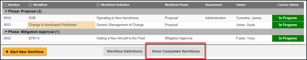 All In Progress MOC workflows are displayed on the summary page, all completed MOC Workflows are stored within the Show Completed Workflows button.