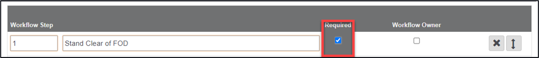 You are able to allocate a step to the workflow owner via a checkbox, any items that are entered in the incorrect order can be moved by using the double ended arrow (dragging and dropping). Any items entered that are not required can be deleted by using the ‘X’ button for each item
