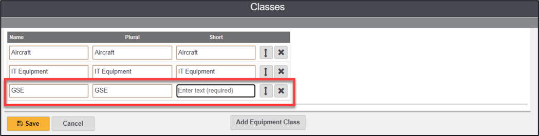 4. In the available boxes, type in the equipment class name