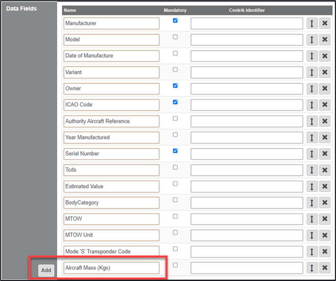 6. Data fields, some fields will be automatically created for you, you are able to overwrite these if required or add in additional fields by using the ‘Add’ button. To move an item in the list, use the double ended arrow, to remove an item use the ‘X’ button. To make an item mandatory, select the checkbox