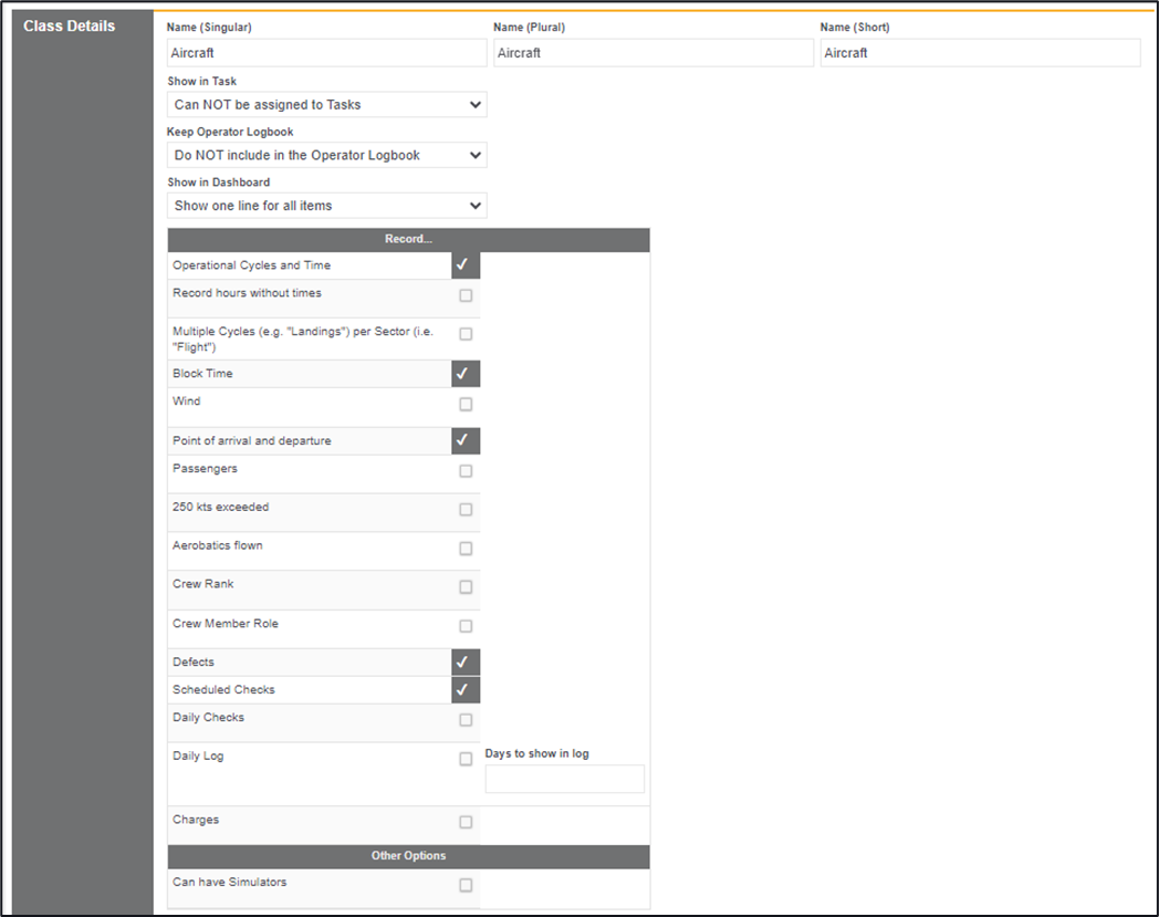 Class Details – Allows you to select areas that you want to record against this class of equipment. As an example, for the class Aircraft you might want to record Operational Cycles and times, Block Time, Passengers, and schedule checks. Whereas for the class IT equipment this might not be required. If you want to include checks of any kind plus the ability to record, and track defects then you will need to ensure that the Defects checkbox, and the Scheduled Checks areas are selected.