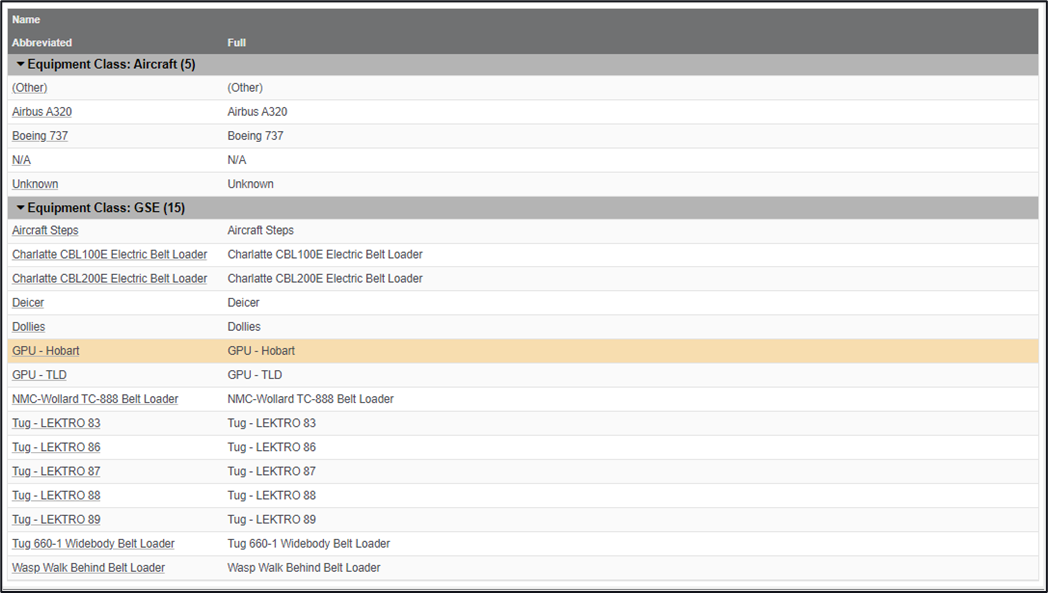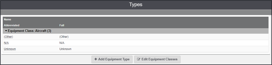 As an example, I create the equipment class Aircraft, and within this class I am able to create different equipment types of aircraft, such as A320, B737 etc.