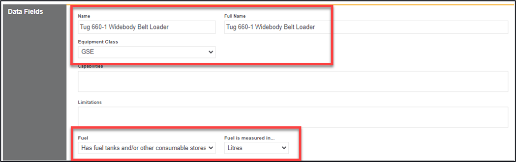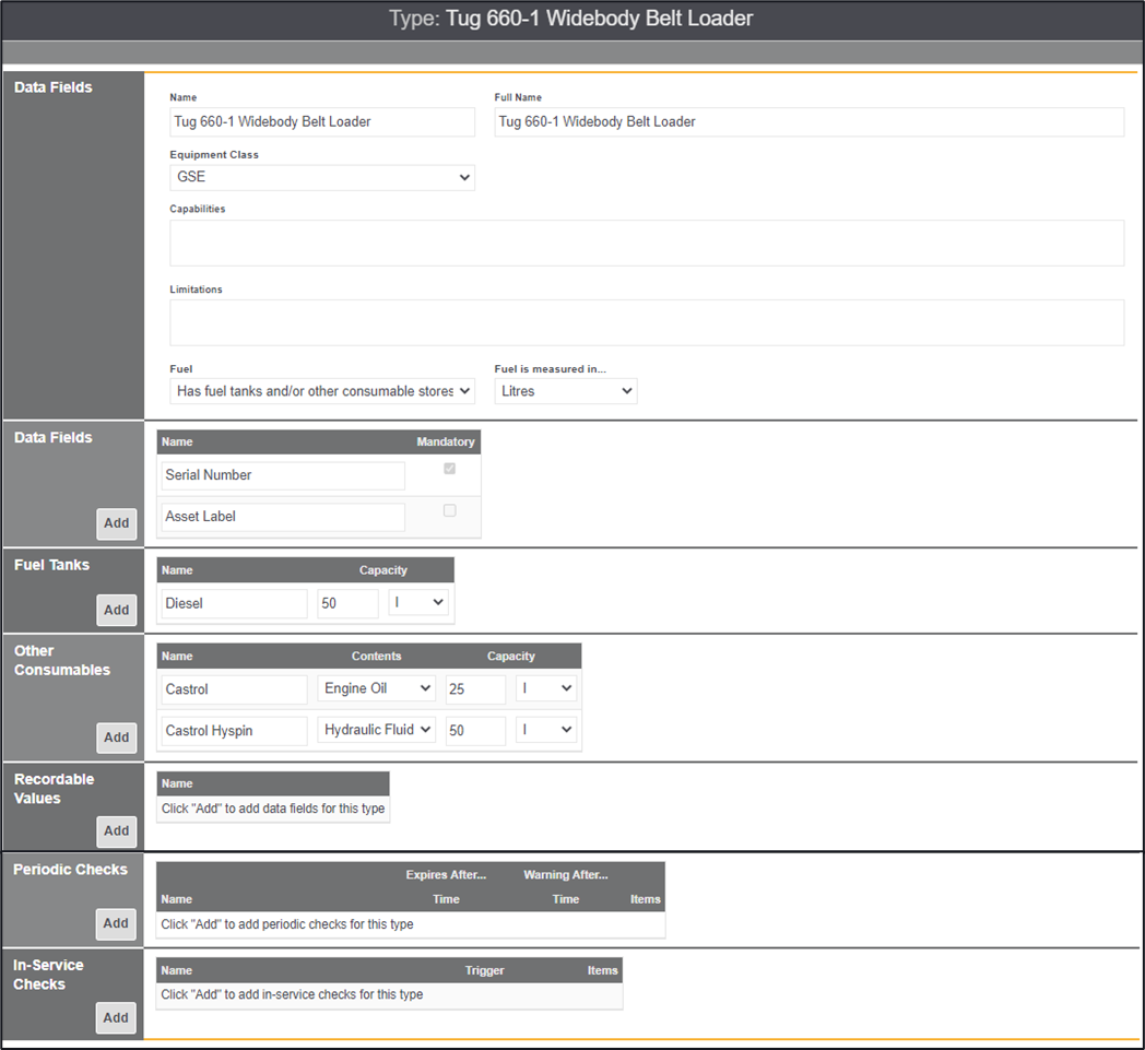 Once the name of this type, the equipment class that this type sits under alongside the data fields and any fuel tanks, and consumables has been created you can add in some checks to this type of equipment. These checks will be added to each equipment item added of this type.