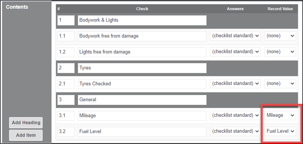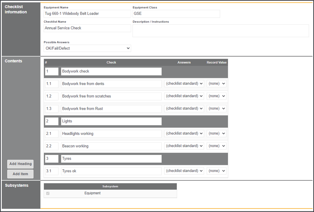 Add Item – these are the checks that you want to be carried out, you can mark items as per the dropdown list for possible answers and associated defects to each item listed
