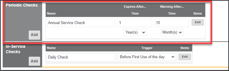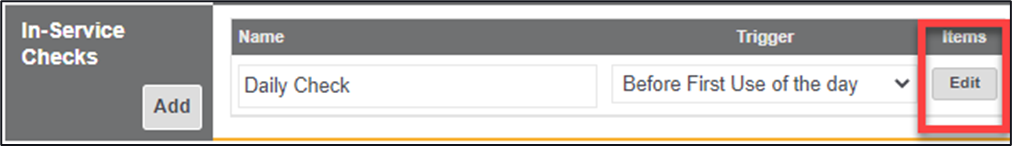 4. Within either the Periodic checks area or the In-service checks area, click on the ‘Edit’ button under the Items area