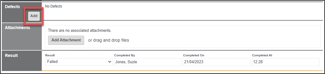 4. Within the Defects section click on the ‘Add’ button